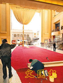 舉行奧斯卡頒獎禮的柯達戲院門前,工作人員忙於鋪展紅地氈。不過主辦單位取消拍攝出席名人活動。(美聯社)