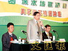 【本報訊】(記者 莊海源)深水步區議會美孚選區將於下星期日進行補選。昨日,三位候選人(民建聯立法會議員楊耀忠、民協佘國雄及民主黨王德全)出席選舉論壇,暢談自己對區議會工作的抱負,並回答市民的提問。