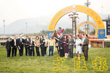 「勝威旺」贏得冠軍,馬主、練馬師在草地上拍攝「威水相」。(冼文達攝)