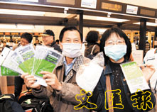 前往內地及香港的台灣旅行團團友,為防範非典型肺炎傳染,均帶上口罩。(中央社)