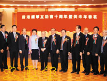 國務院僑辦副主任李海峰(左四)、全國僑聯副主席莊世平齊賀香港緬華互助會成立十周年。 (甄健輝 攝)