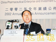 【本報訊】(記者 梁茹)中國製藥(1093)昨宣布截至02年底之年度業績,錄得股東應佔溢利為約2.28億港幣,同比增長63%。每股盈利約0.16元,派末期息0.06元。公司料今年營業額可達25億元,其中成藥銷售額將達8億元