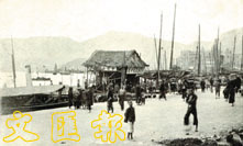 約1900年上環干諾道中的明信片,正中為「來往油麻地什檔」的碼頭,左方為渡海小輪。時價為八百元。