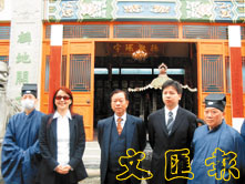 為表達對港人早日戰勝非典型肺炎的祝願,(左二起)民政事務局局長夫人胡慧中、新界鄉議局主席劉皇發及屯門民政事務專員林國強,昨晨到妙法寺及青松觀進行「灑淨息災法會」,包括開壇、上香、誦經等。劉皇發及胡慧中均表示,希望藉祈求上蒼保佑「驅瘟除疫」,全港市民身體健康。