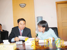 中國製藥集團主席蔡東晨(左)向本報記者介紹抗非典型肺炎的首選藥物阿奇霉素。 (本報北京新聞中心傳真)