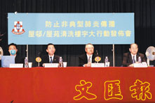 【本報訊】東華三院日前舉行「屋h/屋苑清洗樓宇大行動」發佈會,呼籲屋h及屋苑朋友參與清潔行動,防止非典型肺炎的傳播。