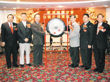 左起:林赤有、陳熹、胡楚南、陳特楚、葉永成、夏國璋齊為天后誕主持鳴鑼儀式。 (鄭群 攝)