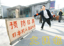 北京郊區的農民禁止外人進入他們的村落,以防SARS擴散。 (法新社)