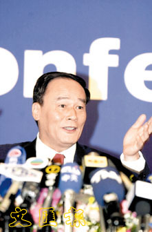 【本報北京新聞中心記者何雁三十日電】中共北京市委副書記、北京市代市長王岐山今日出席了防治SARS新聞發佈會,他的自信、坦率、從容和果斷,給中外記者留下了深刻印象。十天前,王岐山在北京市SARS疫情嚴峻時刻走馬上任,擔任北京市代市長,果斷採取一系列防治和控制措施,加強了疫情信息發佈透明度。