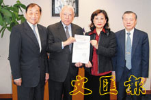香港浙江省同鄉會聯合會會長顧國華(左二)向本報副社長劉永碧遞交二十萬元捐款,請本報代為轉送抗炎勇士劉永佳的遺孀,以示敬意。 (張萍 攝)