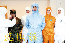 解放軍總後軍需裝備研究所人員在展示他們新研製出的新型抗病毒透氣系列防護服裝。 (新華社)