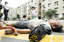 九日,台北萬華大理街一幢五層高公寓因懷疑SARS爆發而封樓。圖為一名醉漢躺在被隔離公寓前以示抗議。(路透社)