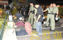 昨凌晨二時許,海傍警署一隊特遣隊警員,由一名警長率同四名警員在中環一帶進行反罪惡巡邏,至皇后像廣場時,發現四名身穿名牌服裝的青年或坐或臥在一角,每人身邊均放有一個手抽紙袋,狀似內地遊客,惟其中一名臥在石礐男子似身體不適。