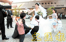 抗疫曙光初現,市民開始享受正常的生活。昨日有二十八對新人在尖沙咀文化中心廣場舉行婚禮。 (張萍 攝)