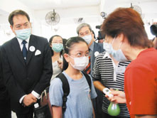 李國章在旁細看義工家長如何為學生探熱。(楊子慧 攝)
