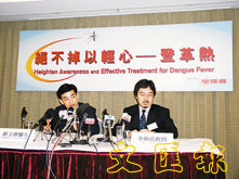 醫學會代表蘇文傑 (圖左) 表示,不排除本港再次爆發登革熱的可能性。中大藥劑學系教授李炯前呼籲市民不要隨便服用阿士匹靈,否則會加重病情。