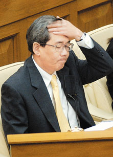 王永平被問及裁減公務員問題時,輕拍額頭。 (李志樑 攝)