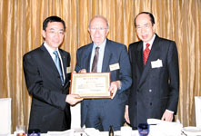 李東海主席(右)、鍾逸傑會董(中)代表東華歷屆主席會致送感謝狀予楊超成主席。 (鄭群攝)