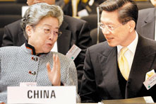 中國國務院副總理兼衛生部長吳儀、香港特區衛生福利及食物局局長楊永強十九日出席第五十六屆世界衛生大會。十八日,吳儀聽取了楊永強有關香港抗擊非典情況的匯報。 (美聯社)