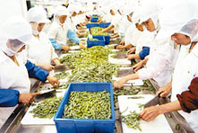 廈門市採取多種措施,幫助在廈投資、經商的台胞應對非典,截止目前為止,廈門市2057家台資企業運轉正常,沒有一家企業因非典停工,也沒有一個台商、台胞或企業員工發生非典病例。 圖為台資企業的工人們五月緊張地生產準備出口日本的毛豆。 (中新社)