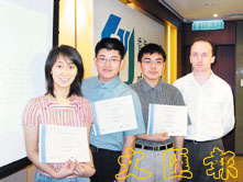 獲獎的城大學生(左起):數學系黃媛媛、電子工程學系吳伯平、數學系梁向東。圖右為得獎同學的顧問、城大數學系助理教授Jonathan Wylie博士。