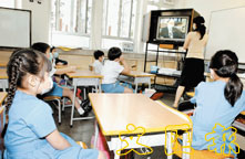 小一同學們正在留心收看宣傳防炎意識的VCD。 (李志樑 攝)