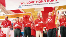 振興香港活動廣受官民支持,圖為唐英年與各國駐港商會會長為愛心行動之慈善義賣剪綵。 (張萍 攝)