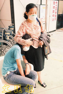 為了防範SARS疫情入侵急診室,全台重要醫院接連成立發燒篩檢站,但繁瑣的篩檢過程讓急症的病人久候不耐。圖為在忠孝醫院急診室外一名婦人帶著女兒候診。 (中央社)