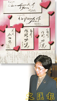 昨日某報章頭疊底頁的一角位置,有一個十分搶眼的廣告。廣告約佔版面的四分一,以粉紅底色襯托出多幅中英文「字畫」,再配以大小不一的粉紅「心心」作點綴。至於字畫的上款則寫著「Margaret」、「珍E」和「富珍」--三個稱謂所指實為同一人,即是被「老友記」戲稱「出鏡率比紅星還要高」的衛生署署長陳馮富珍。自當上衛生署的「四三○」新聞發布會主持人後,陳太確實每天都在「公仔箱」出現,這亦令她八位老友不得不登報大讚「你好叻呀」。他們更為她感自豪,並表示希望「沙士」快點過去,讓他們可以一起「享受『清』靜和安『寧』」。