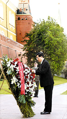 胡錦濤向莫斯科無名烈士墓敬獻花圈。 (法新社)