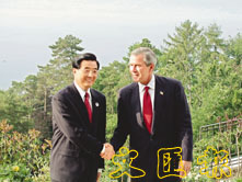 中國國家主席胡錦濤和美國總統布什在會談前互相握手。(陳波 攝)