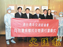 【本報訊】(記者 張萍)香港「港台青年交流促進會」昨天下午舉行向台灣捐贈抗炎物資的付運儀式,由該會會員捐贈的二千多套保護衣物和兩萬個外科手術口罩將會運送給台北市政府,以表達香港市民對台灣民眾的一片心意。