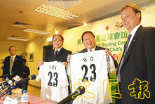 何志平和霍震霆獲皇馬代表繆立德贈送印有「23」號的皇馬球衣,該號碼球衣為名將碧咸所穿。(潘志南 攝)