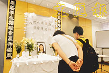 天水圍香港學生輔導會小學昨日為車禍中罹難的蔡愛蓮老師舉行追思會,讓老師、學生和家長前來致祭,學校瀰漫一片傷感氣氛,有家長讚揚蔡老師教學負責,又能提升學生的學習興趣。追思閣佈置簡單清雅,檯上擺放插有白玫瑰及百合花的花瓶,中間放了蔡老師生前穿畢業袍的遺照,兩邊是以「愛」及「蓮」字的嵌字挽聯,表達對蔡老師的懷念。