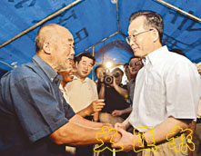 7月12日,溫家寶在安徽阜陽市趙郢村看望慰問受災群眾。 (新華社)