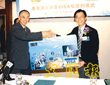 伍步剛(左)向香港潛水總會主席張衛(右)頒發第一張潛水會信用卡。 (張偉民 攝)