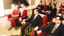 國家主席胡錦濤下午三時許在人民大會堂福建廳會晤董建華。眾香港記者七嘴八舌向胡錦濤主席發問,「支不支持董建華」、「對遊行怎樣看」,一時間粵語普通話混雜,甚難聽清。