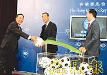 左起:投注事務執行總監陳承楷把足球交給主席夏佳理、公司發展事務執行總監麥建華。 (趙焜崗 攝)