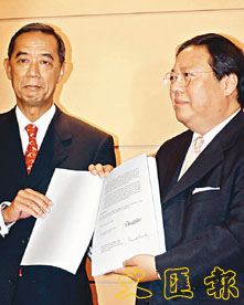 馬會主席夏佳理從何志平手上接過足球博彩牌照。 (趙焜崗 攝)