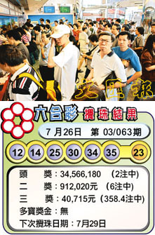 【本報訊】(記者 霍青松)全港矚目、頭獎一注獨中派彩高達六千九百萬元的六合彩,昨日共有兩注中頭獎,每注派彩高達三千四百五十六萬多元,二獎有六注中,每注派九十一萬二千零二十元。