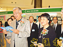 教統局副秘書長祝建勳(左)及勞工處副處長左陳翠玉一同出席「中學生出路資訊Show」,鼓勵年青人積極面對將來,多進修其他課程,自我增值。(王家敏攝)