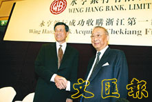 馮鈺斌(左)稱,收購浙一後有利擴大營運規模及客戶基礎,增加永亨盈利能力。旁為浙江第一銀行董事長孔祥勉。 (張偉民 攝)