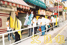 【本報訊】美孚麗灣花園「老人院變長生店」事件餘波未了,昨日竟出現「棺材大巡遊」!八名珠海書院新聞系學生,不惜為日薪四百元的代價及冒惹上官非風險,白衣素服,手捧紙人,舞動幡旗,充當「受薪孝子」,連同逾廿名暑期工學生加入巡遊隊伍,以壯聲勢。但當他們將棺木搬入大廈內引起住客憤怒,險與學生發生衝突,最後驚動警員到場調停,事件方告平息。