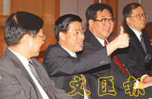 廣東省省長黃華華訪中聯辦,他在談話中豎起大拇指讚賞兩地經貿合作。(李志樑 攝)