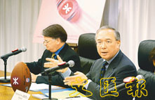 錢果豐以欖球比喻地鐵的發展,欖球圓周代表服務社會,尖頂部分代表商業原則,兩者一定要配合。 (趙焜崗 攝)