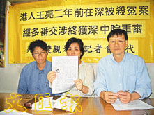 【本報訊】(記者 任智鵬)港人王亮在深圳被殺案,經他雙親兩年來的申訴,日前被深圳市中級人民法院獲准重審,王亮的父母對案件終獲重審表示欣慰,並向各界致謝,希望能為他們的兒子討回公道。