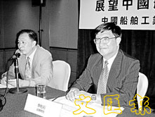 中國船舶工業集團副總經理李柱石(右)表示,正準備競投港珠澳大橋的鋼結構項目。左為該集團另一位副總經理聶成根。 (卓建安 攝)