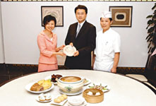 署理投資推廣署署長曾愛蓮送贈紀念品予王家沙董事總經理陳海寶(中),旁為王家沙新店大廚梁師傅。 (趙焜崗 攝)