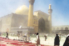 伊拉克納杰夫的阿里清真寺周五發生炸彈爆炸後,伊拉克人紛紛逃離現場。 (法新社)