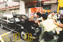 當董建華座駕到場,場面更加混亂!只見警員手挽手地圍成一個圈,阻止長毛們鬧事。豈料他們從警員的縫隙衝入去,「長毛」更「突襲」成功,伏在董建華車上,亦有「倒董」人士倒在地上,攔阻董建華的座駕進場,甚至有人狂拍特首乘坐的車輛……這些人與前來保護的警員扭成一團,並伴著董建華的座駕往前走,場面十分混亂!